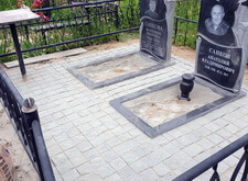 Памятник аккуратнейшим образом крепим на подставку, к которой пристраиваем цветник. Ту же операцию повторяем и со вторым надгробьем. Памятники выставляем строго на одной линии, параллель, а также горизонталь цветников проверяем с помощью уровня. Чёткая установка исключает не только наличие визуальных дефектов, но и имеет практическое значение: поставленный «как надо» памятник в дальнейшем не завалится на бок, а благодаря обкладке брусчаткой и не просядет вниз.